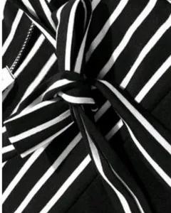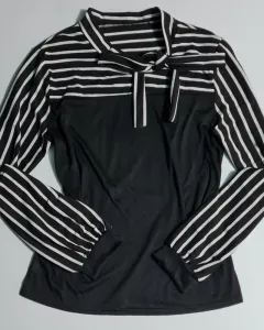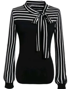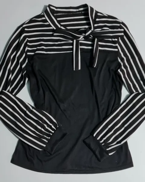 Hermosa y elegante blusa de manga larga, con rayas a blanco y negro, tiene cuello alzado y corbata! 👌AjustableColor: Blanco y negroManga: largaTalla: LUsada una sola vez, se conserva como nueva!!