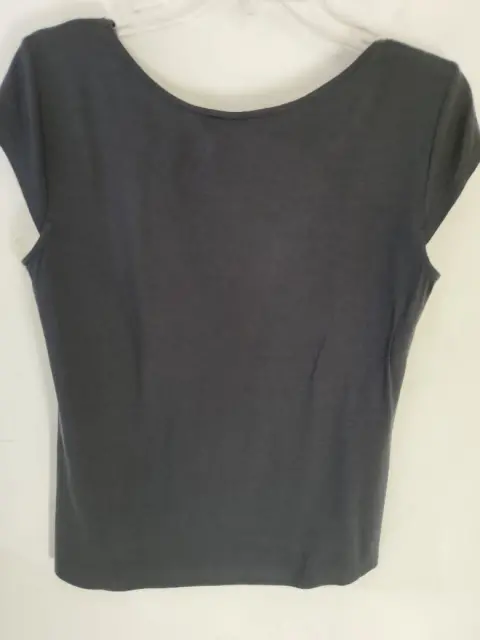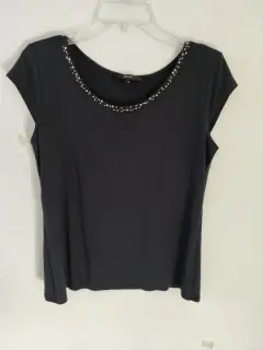 Blusa Mangas Cortas con Pedrería. Blusa negra cuello redondoCon aplicaciones de brillo en el cuello.El color en la segunda foto se ve claro por la luz, pero el color es firme.Más que negra, es gris Oxford muy oscuroNueva sin etiquetaJulio Talla 10