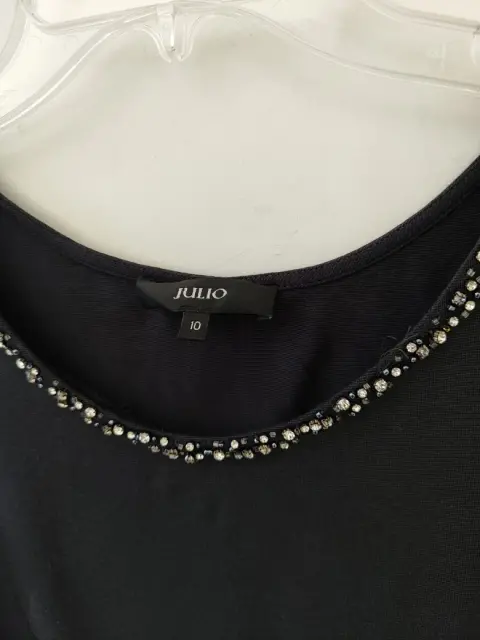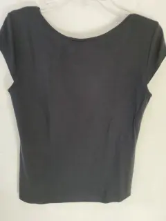 Blusa negra cuello redondoCon aplicaciones de brillo en el cuello.El color en la segunda foto se ve claro por la luz, pero el color es firme.Más que negra, es gris Oxford muy oscuroNueva sin etiquetaJulio Talla 10