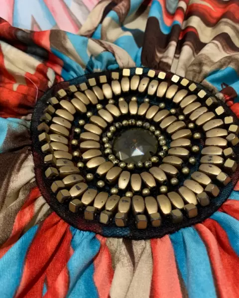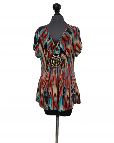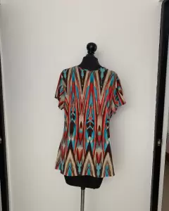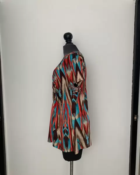 Bonita, cómoda y ligera blusa en talla 2X con precioso adorno de pedrería y bonito escote en V. Medidas 58 cm de axila a axila y 72 cm de largo