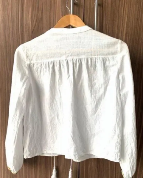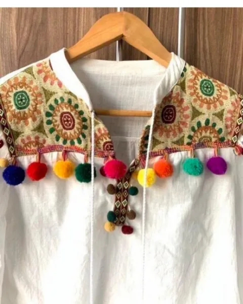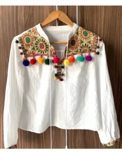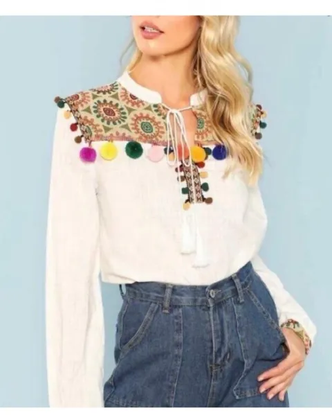 Blusa multicolor con borlas de colores. El material es de tipo manta. Bellísima estilo mexicana. Medidas 42 cm de hombro pecho 100 cm es talla S pero viene amplia