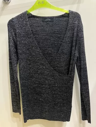 Blusa metalizada nueva julio escote. Blusa talla chica manga larga tejido metálico negro plateado con escote, se ajusta pegadita, muy sexy! Nueva con etiqueta. Sin detalles.