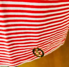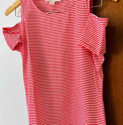 Es súper ligera el color es rayas rojas con blanco el detalle de los hombros está genial y los accesorios de la marca la hace lucir mucho