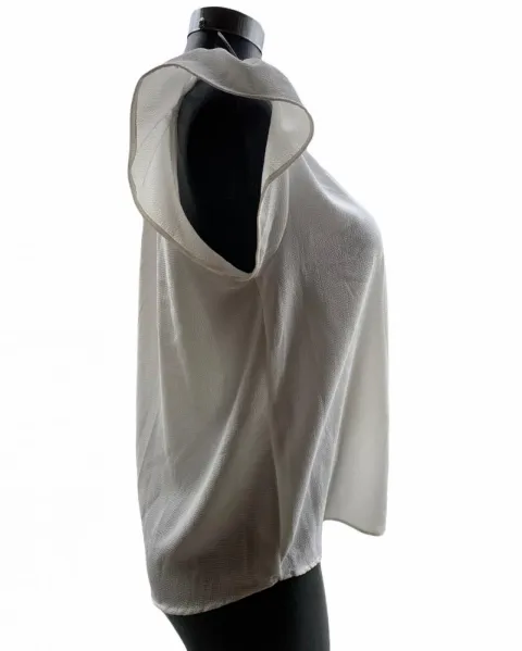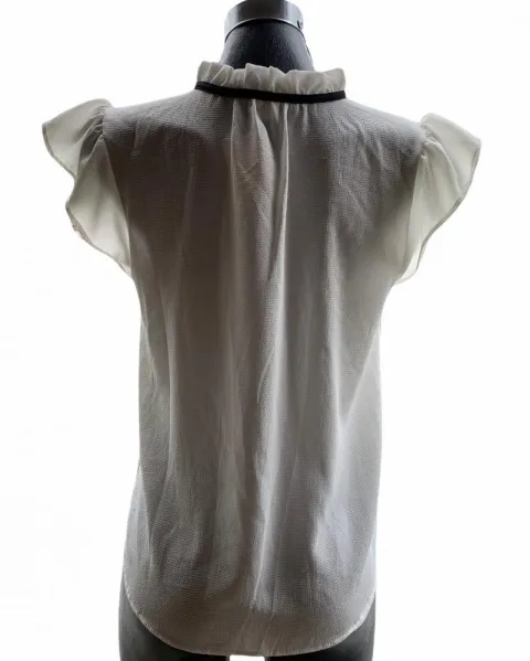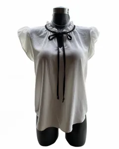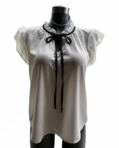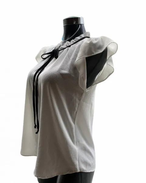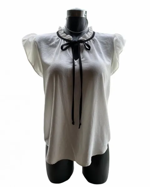 Blusa de la Marca MINE, en color blanco aperlado, Talla S, con liston en el cuello en color negro.