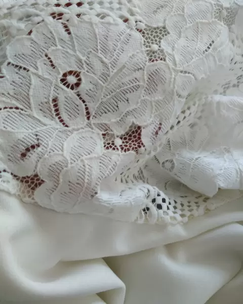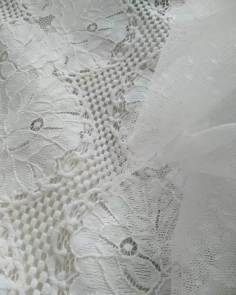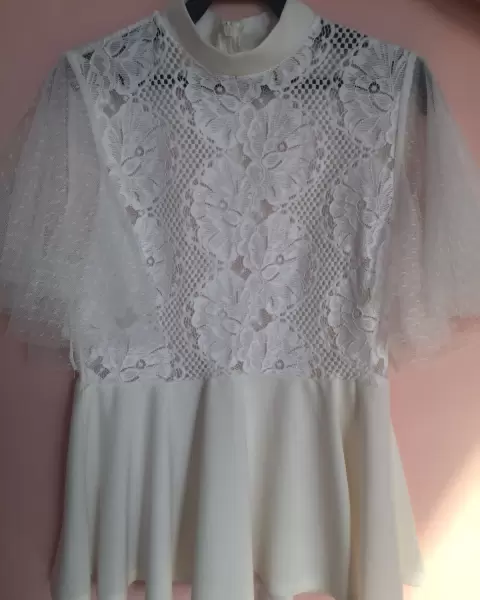 Blusa con manga circular y de tul y con encaje cierre atrás en el cuello, y la parte de abajo es circular
