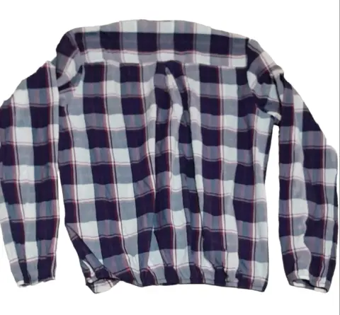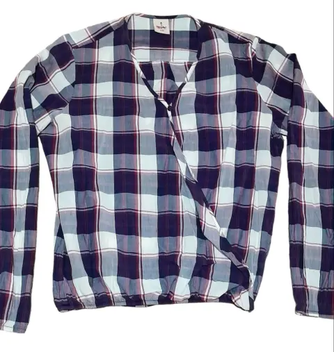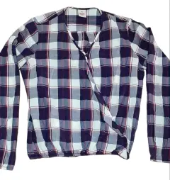 Blusa Mossimo Talla G (32). Blusa a cuadros, color azul marino, blanco y rojo oscuro. Casual, manga larga. Tela fresca, con resorte en la parte inferior y mangas. (La primera imagen es de muestra). Sin detalles.
