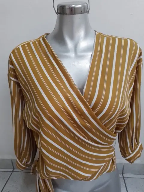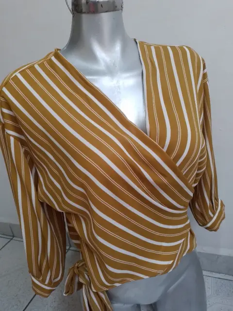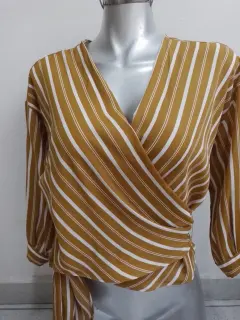 Linda blusa 👚 juvenil, talla mediana, color mostaza con rayas blancas, con cinta de amarre, poco uso, sin detalles, para armar un lindo outfit