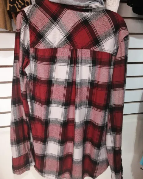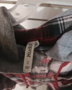 Blusa Mudd. Bonita blusa de franela con capucha, tela de cuadros, gorro grisy aplicación de bolsa en el pecho de lado izquierdo.