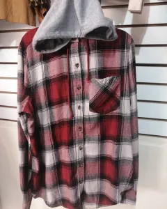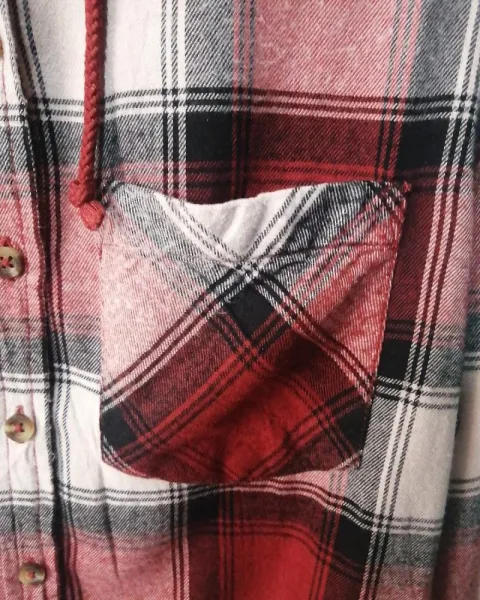 Bonita blusa de franela con capucha, tela de cuadros, gorro grisy aplicación de bolsa en el pecho de lado izquierdo.