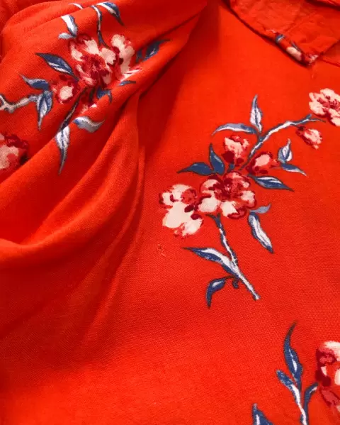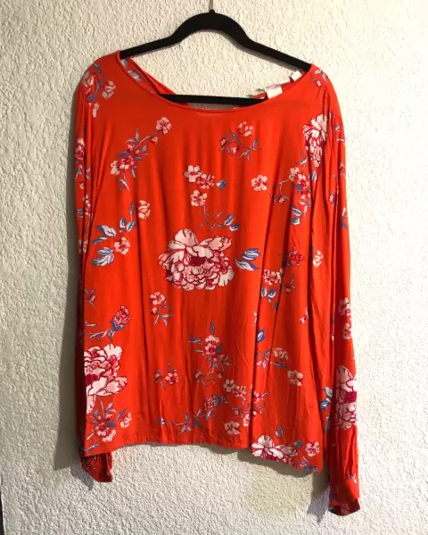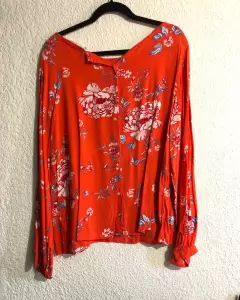 Blusa naranja floreada H&M. Súper cómoda, las mangas se ven súper bonitas, tela fresca, ideal para clima cálido. Tiene un pequeñito detalle (no se nota, lo muestro en foto)Medidas: axila a axila 59 cm (118 cm circunferencia total)