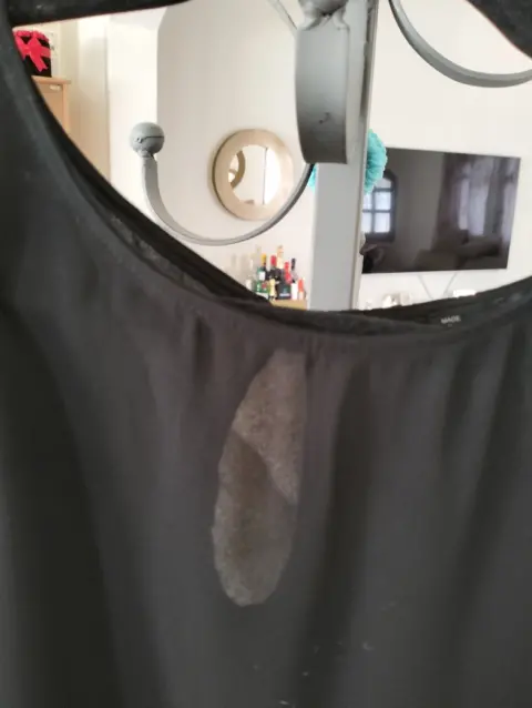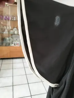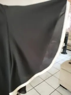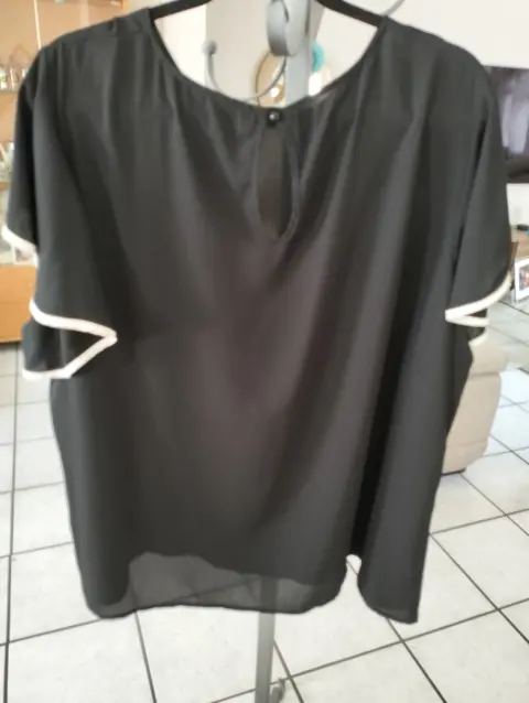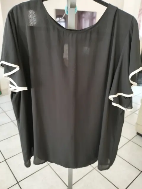 BLUSA NEGRA. Blusa negra de manga corta con vuelo y bies blanco cuello redondo botón en espalda es una blusa suelta largo a la cadera