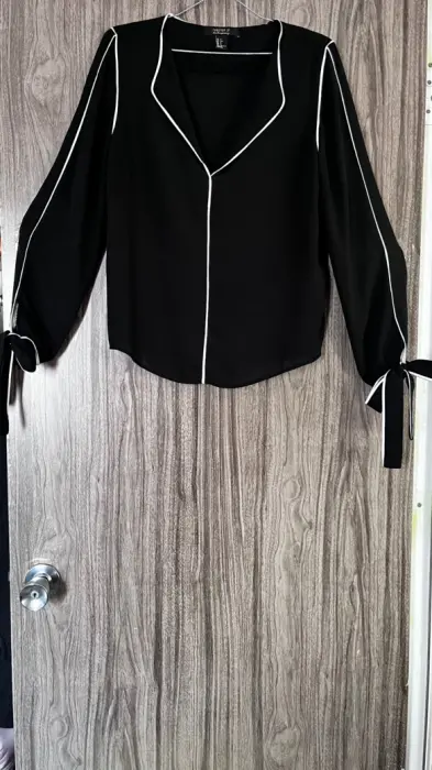 Blusa negra con detalles blancos ligera. Hermosa blusa negra con detalles blancos y en las mangas listones para amarrarlas en forma de moño, es muy ligera