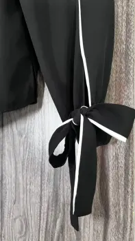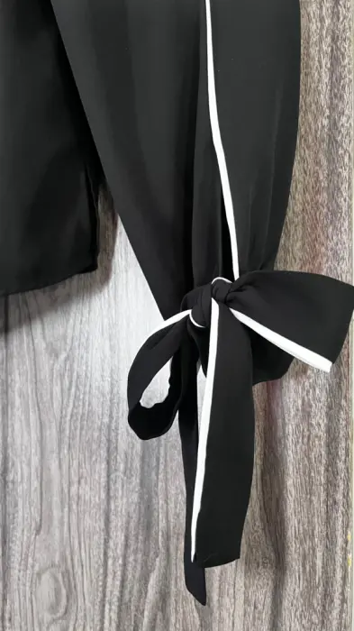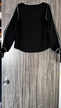 Hermosa blusa negra con detalles blancos y en las mangas listones para amarrarlas en forma de moño, es muy ligera