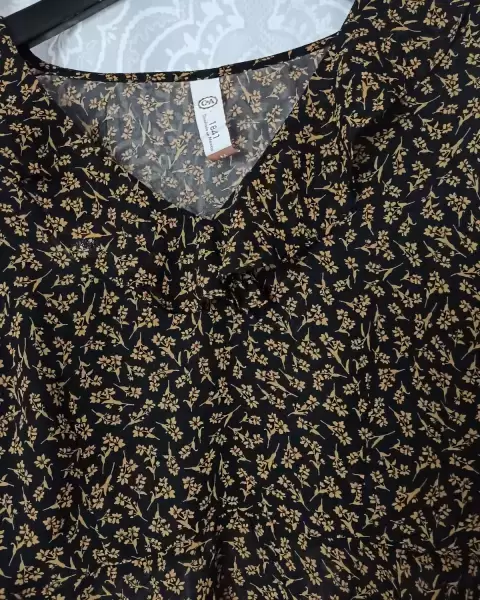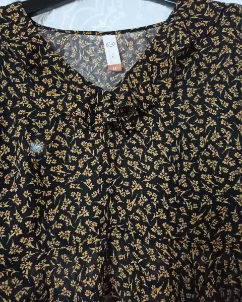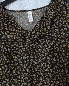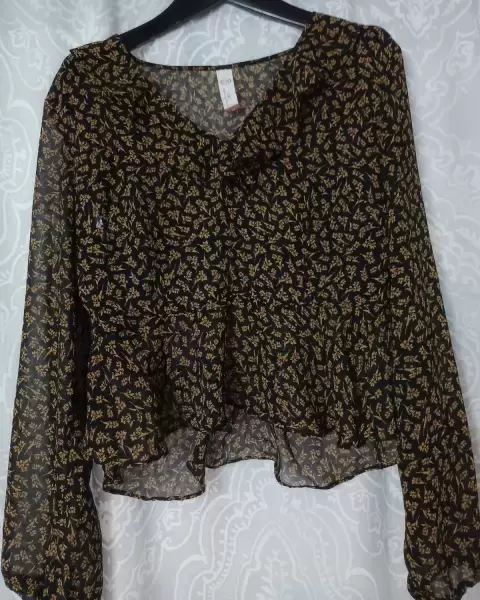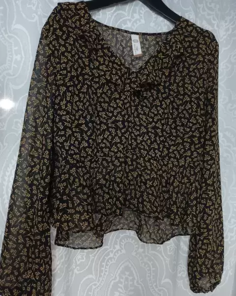 Blusa negra con detalles de flores. Blusa negra , con detalles en el cuello, escote tipo V, manga larga, sin ningún detalle.