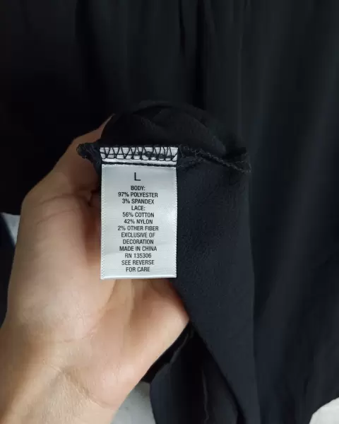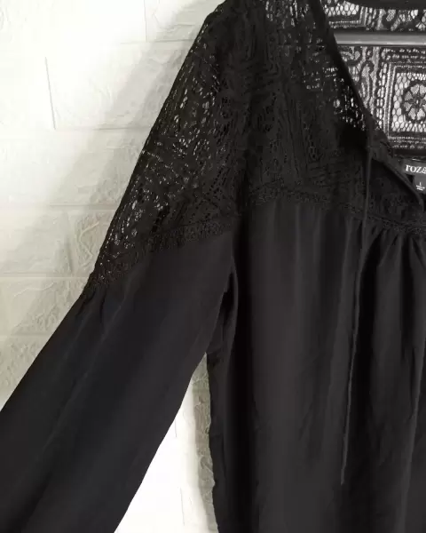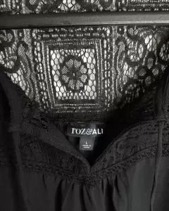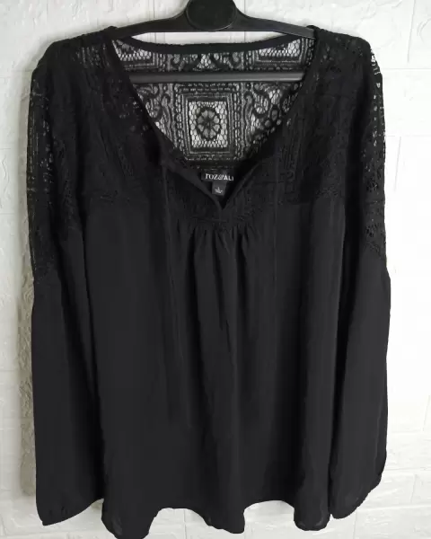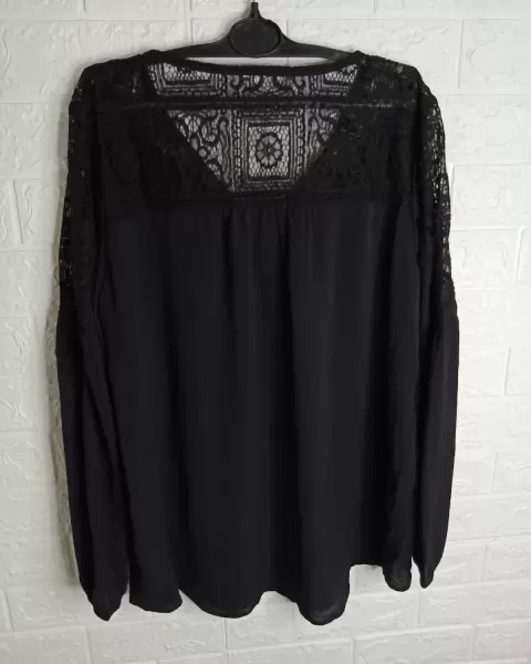 Blusa negra con encaje en los hombros y atrás. De manga larga. Tela poliéster, es fresca. Super versátil. Para usar formal o casual. En perfecto estado