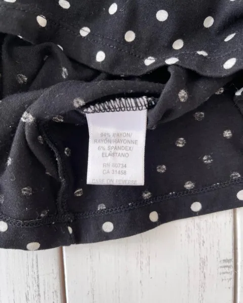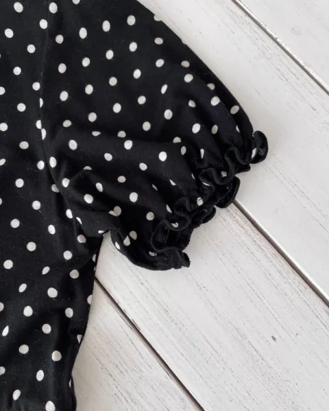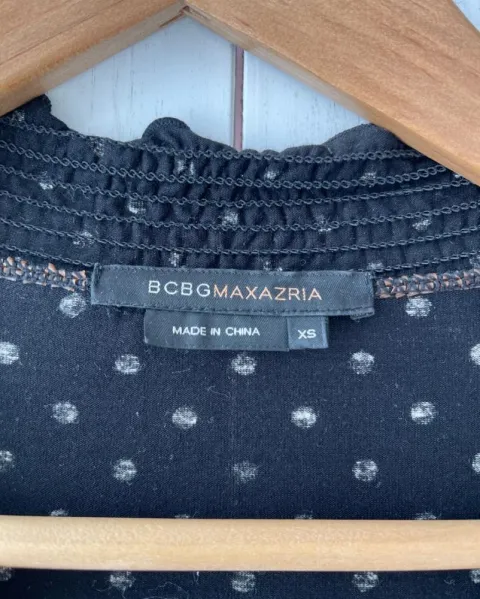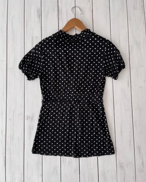 Blusa negra con lunares blancos BCBG. Talla: XSMedidas: 38 cm de hombros, 40 cm de axila y 68 cm de largo.Los resortes del cuello y cintura presentan desgaste.