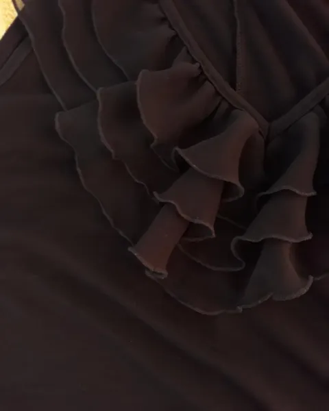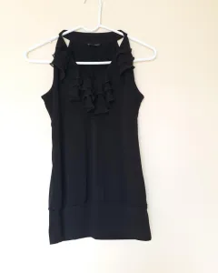Blusa negra con olan enfrente. Blusa negra sin mangas, con cuello en V y olanes en tela transparente , la parte de atrás también termina en V. Excelente estado.