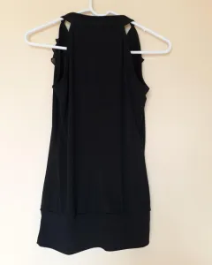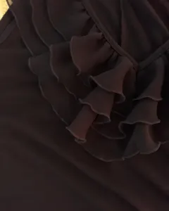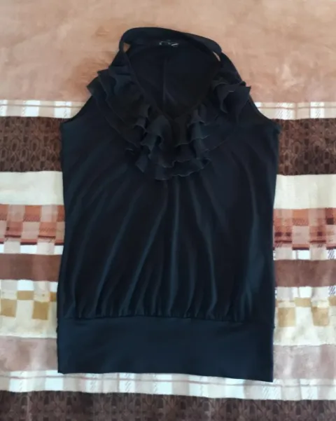 Blusa negra sin mangas, con cuello en V y olanes en tela transparente , la parte de atrás también termina en V. Excelente estado.