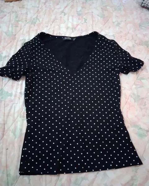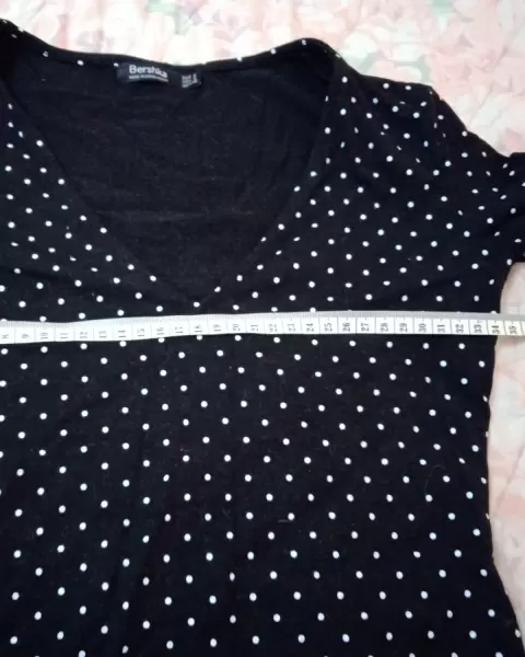 Hermosa blusa color negro con pubtitos blancos, talla CH marca Bershka, tiene cuello V, s eve muy bonita puesta, moldea la figura.