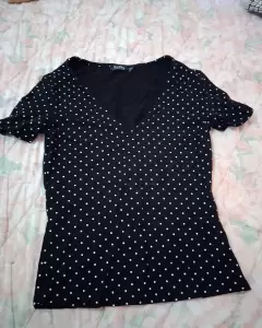 Blusa negra con puntitos blancos. Hermosa blusa color negro con pubtitos blancos, talla CH marca Bershka, tiene cuello V, s eve muy bonita puesta, moldea la figura.