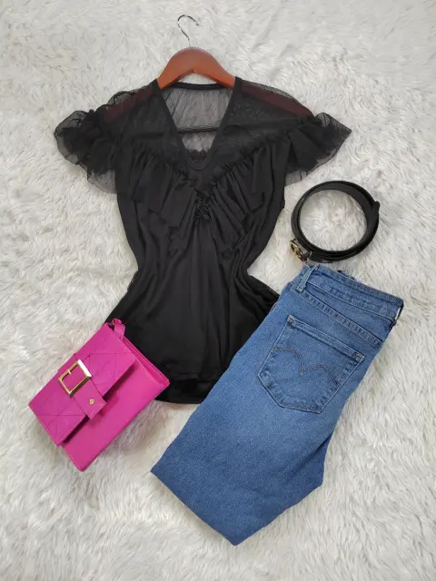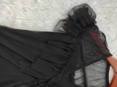 Blusa negra con transparencia y olanes en los hombros.Muy bonita queda bien a una talla Ch o MNueva sin detalles