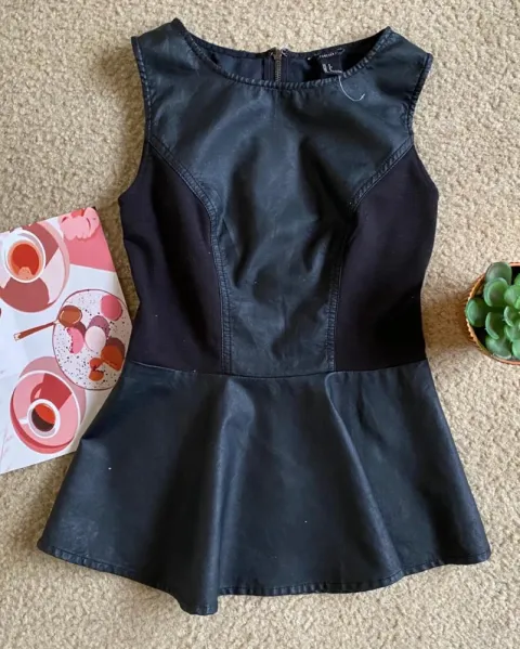 Blusa sin mangas, y detalle de vinipiel, con caída de Olán a la altura de la cintura y se abrocha con cierre en la parte de atrás