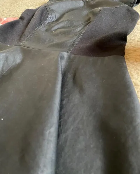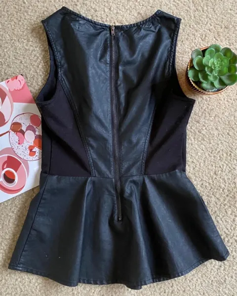 Blusa negra con vini piel. Blusa sin mangas, y detalle de vinipiel, con caída de Olán a la altura de la cintura y se abrocha con cierre en la parte de atrás