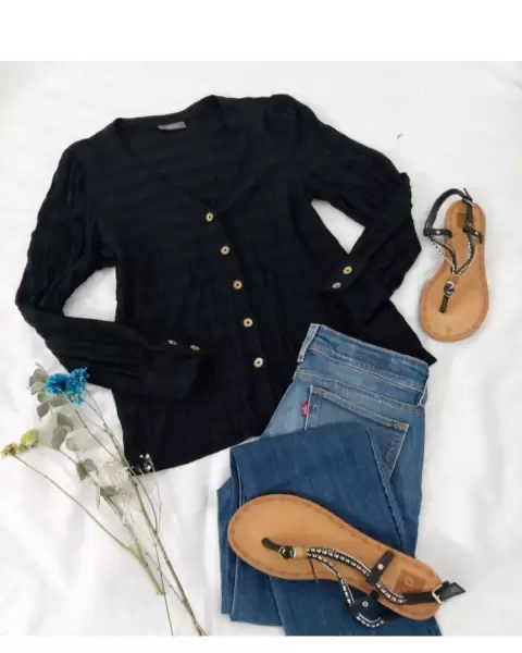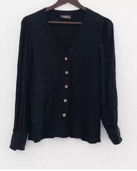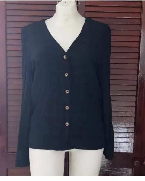 Blusa negra corrugada de botones. De las prendas básicas para lucir perfecta. Tela tipo corrugada.Muy linda y combinable. Usala asi o con una blusa por dentro tipo cardigan. Talla 38 americano es como M/L. Revisa tus medidas.Medidas planas:De axila a axila: 50 cmHombros: 39 cmLargo: 62 cm