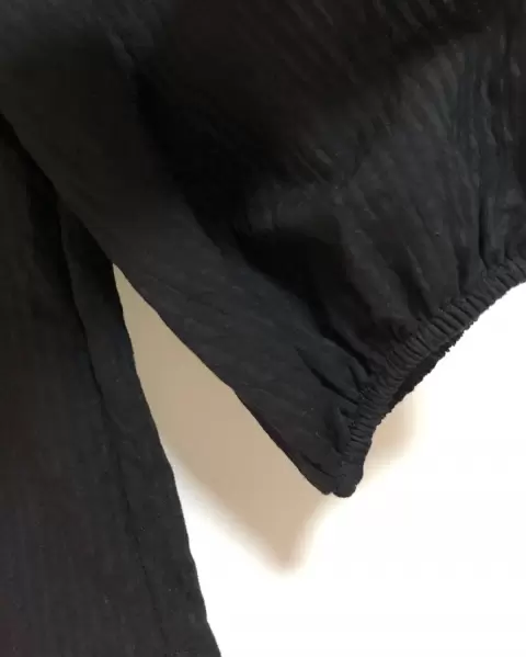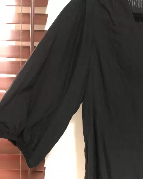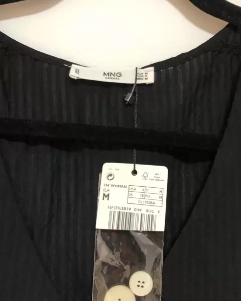 Blusa de textura con botonesMarca MangoColor NegroTalla M78% viscosa, 22% poliamidaCuello en picoManga 3/4 abullonadaPuños elásticos Cierre de botones en la parte delantera