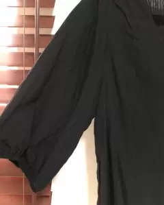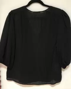 Blusa negra de botones. Blusa de textura con botonesMarca MangoColor NegroTalla M78% viscosa, 22% poliamidaCuello en picoManga 3/4 abullonadaPuños elásticos Cierre de botones en la parte delantera