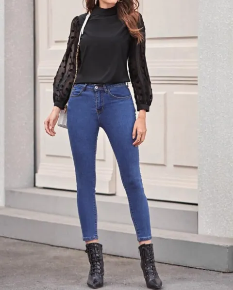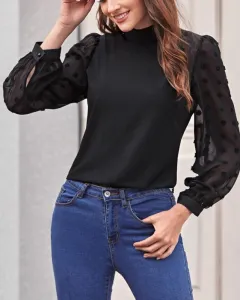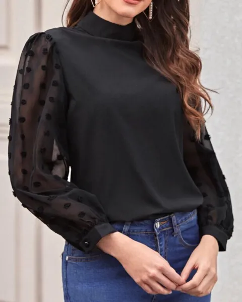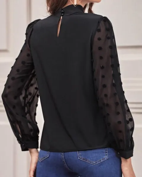 Blusa de cuello alto color negro con mangas de malla y detalles de puntos negros que la hacen ver sensacional!!!🤩