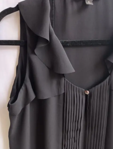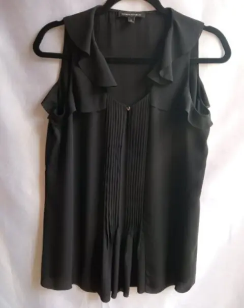 Blusa negra, detalles olanes. Blusa Banana Republic, detalle de olanes en los hombros y drapeado en el torso, muy fina y femenina.Talla S (viene un poco amplia, puede quedar M)Medidas tomadas por un solo lado*A-A 47 cm*Largo 66 cm