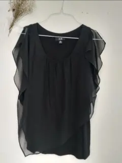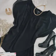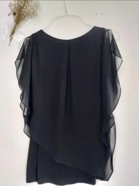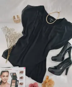 Elegante blusa color negra, talla M, la tela interior es rayón con strech, se ajusta perfecto al cuerpo, la tela exterior es poliéster tipo chiffon.Marca AGB