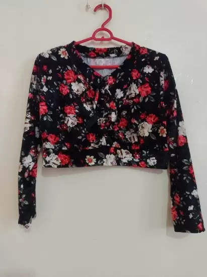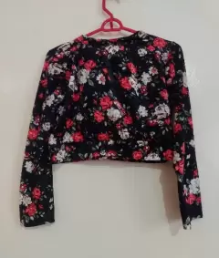 Blusa negra floreada. Blusa de tela negra floreada, con cordón ajustable, tipo ombliguera