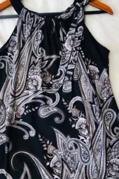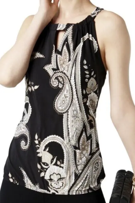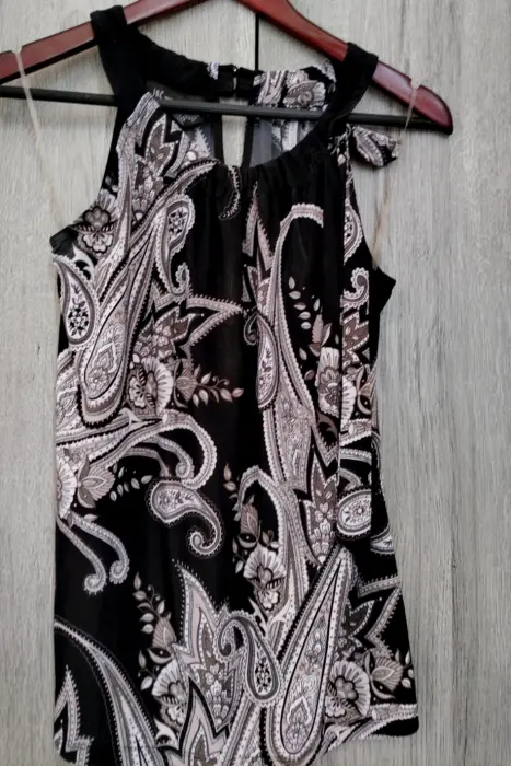 Blusa negra con patrones en blancoTela pesada/ americana marca I.N.CTalla chicaA la altura del halter tiene una tira que puedes hacer moño o adorno que gustesUna puesta/sin detalles