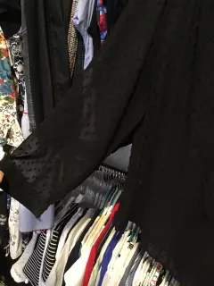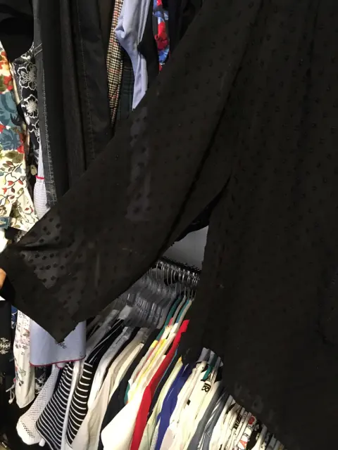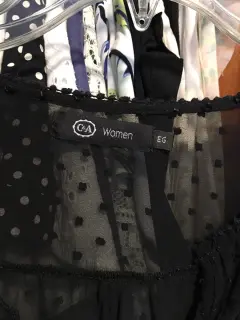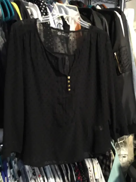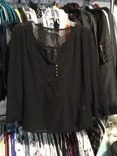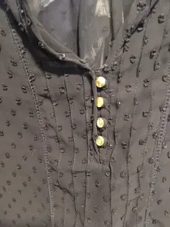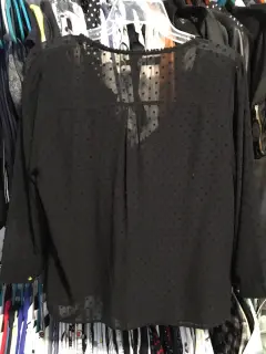 Linda blusa negra semitransparente con lunares tejidos de la misma tela. Poco uso. Sin detalles. Medidas: hombros 40cm, axilas 56cm, cintura 56cm, cadera 57cm, largo 62cm. Manga 3/4
