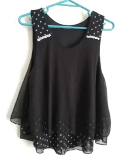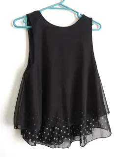 Blusa negra semitransparente con brillos. Blusa sin mangas semitransparente con brillos enfrente, talla chica, muy fresca y amplia en la parte inferior, tela delgada y q estira