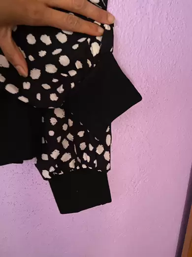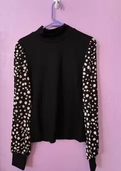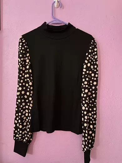 Blusa negra con cuello alto y manga larga. Es talla S, está nueva, tiene detalles en la parte de las mangas: puntos blancos y los puños terminan con una franja negra. Marca Shein