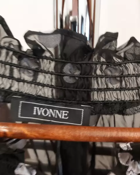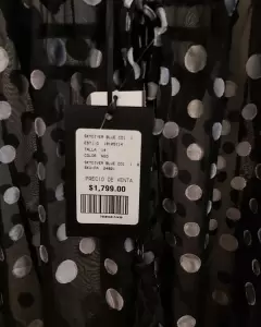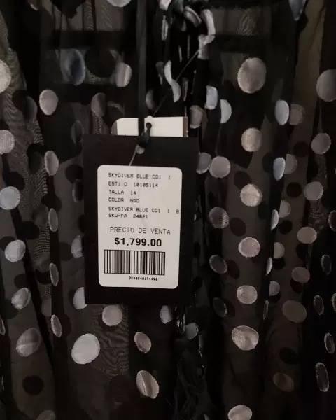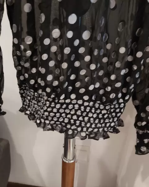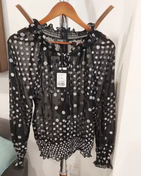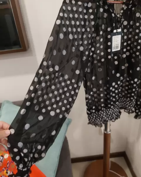 Blusa negra transparente con estampado de bolitas platasResorte en la parte de abajo y en los puños Cuello redondo Precio original: $1,799