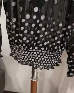 Blusa negra transparente. Blusa negra transparente con estampado de bolitas platasResorte en la parte de abajo y en los puños Cuello redondo Precio original: $1,799