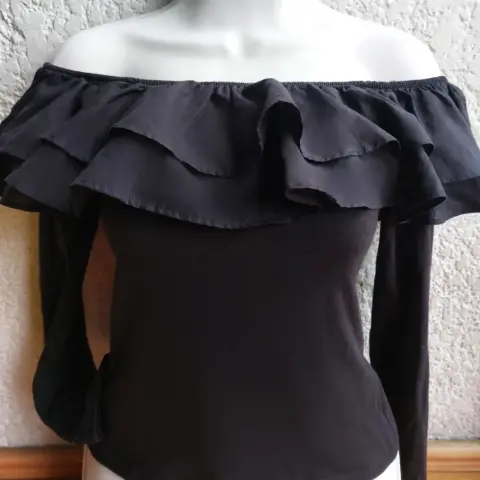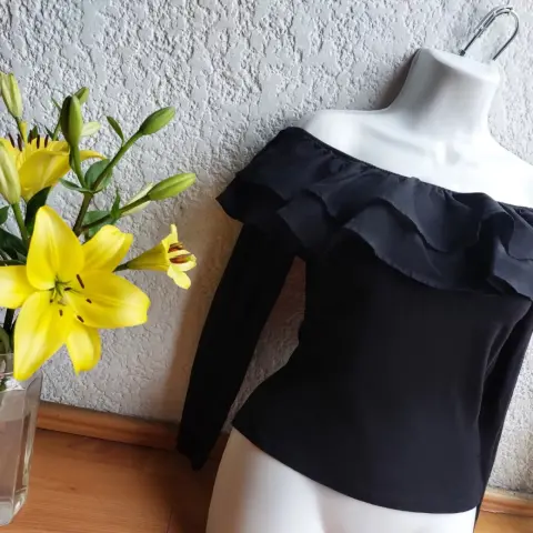 Blusa NUEVA con olanes. Talla XS queda a S.Marca HMEstado: nuevo sin etiqueta.Color negro.Ancho: 13 cmsLargo: 16 cmsTela estira un poco. Con olanes.manga larga.strapless.nunca usado.