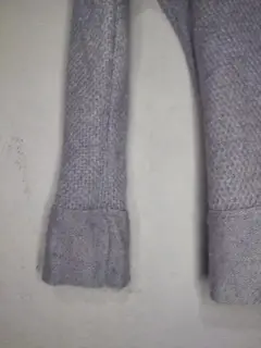 La tela es gruesa y caliente, queda justo la tela no estira mucho, es color lila, tiene unos detalles unos hilos jalados ( se ve en las fotos).