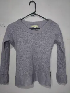 Blusa o suéter. La tela es gruesa y caliente, queda justo la tela no estira mucho, es color lila, tiene unos detalles unos hilos jalados ( se ve en las fotos).