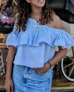 Hermosa blusa con olanes la puedes usar con el hombro arriba o abajo, la tela es tipo popelína pero de algodón es fiel a su talla, el largo se muestra en la foto.