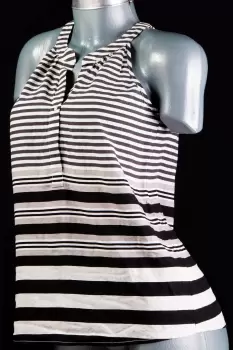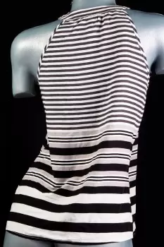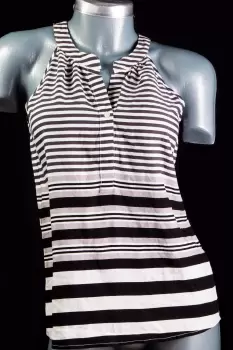 Blusa sin mangas Old Navy a rayas negras, gris y blanco. Tela ligera. Es talla S, mide 46 cm de axila a axila y 62 cm de largo.