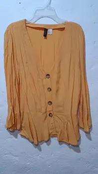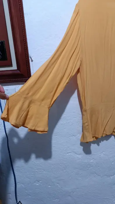 Blusa amarilla con escote en V, botones delanteros, la manga es mía en la zona de la muñeca , solo se usó una.vez