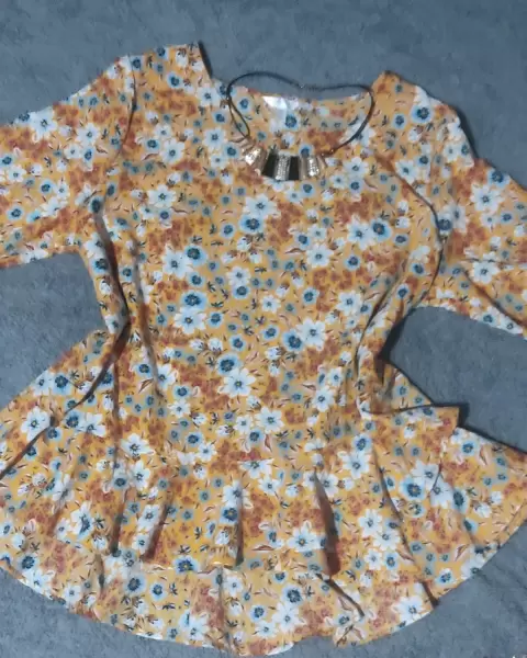 Blusa peplum de la marca TIME AND TRUE TM, talla 2x, color amarillo mostaza con flores azules