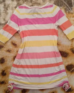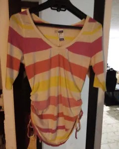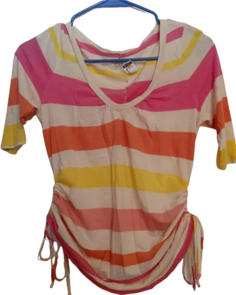 Blusa transformable, rayada. Tiene tiras ajustables a los lados para hacerla corta y plisada Manga tres cuartos. La tela es muy suave, de algodón. Y los colores son más apastelados y bonitos. Viene amplia queda a chica y mediana.