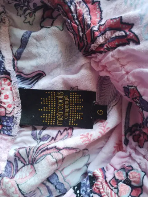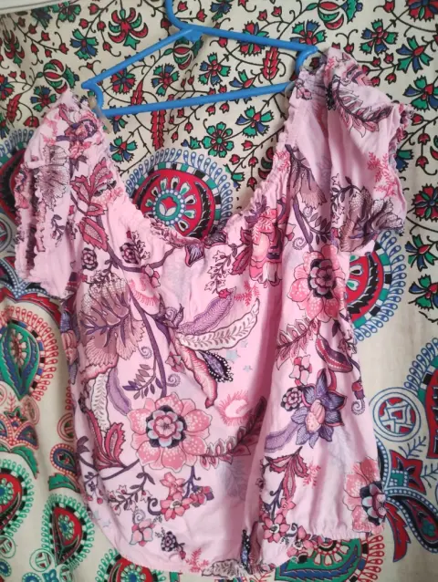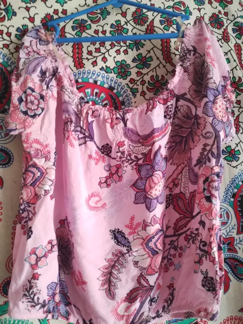 Blusa con estampado primaveral. Tela fresca. No tiene detalles. La marca lo maneja como L pero viene reducida, es lo equivalente a M.