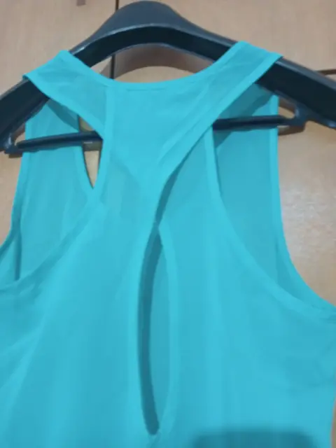 Blusa primaveral color turquesa de poliéster, cuello redondo, escote cruzado en la espalda, bolsita enfrente, asimétrica